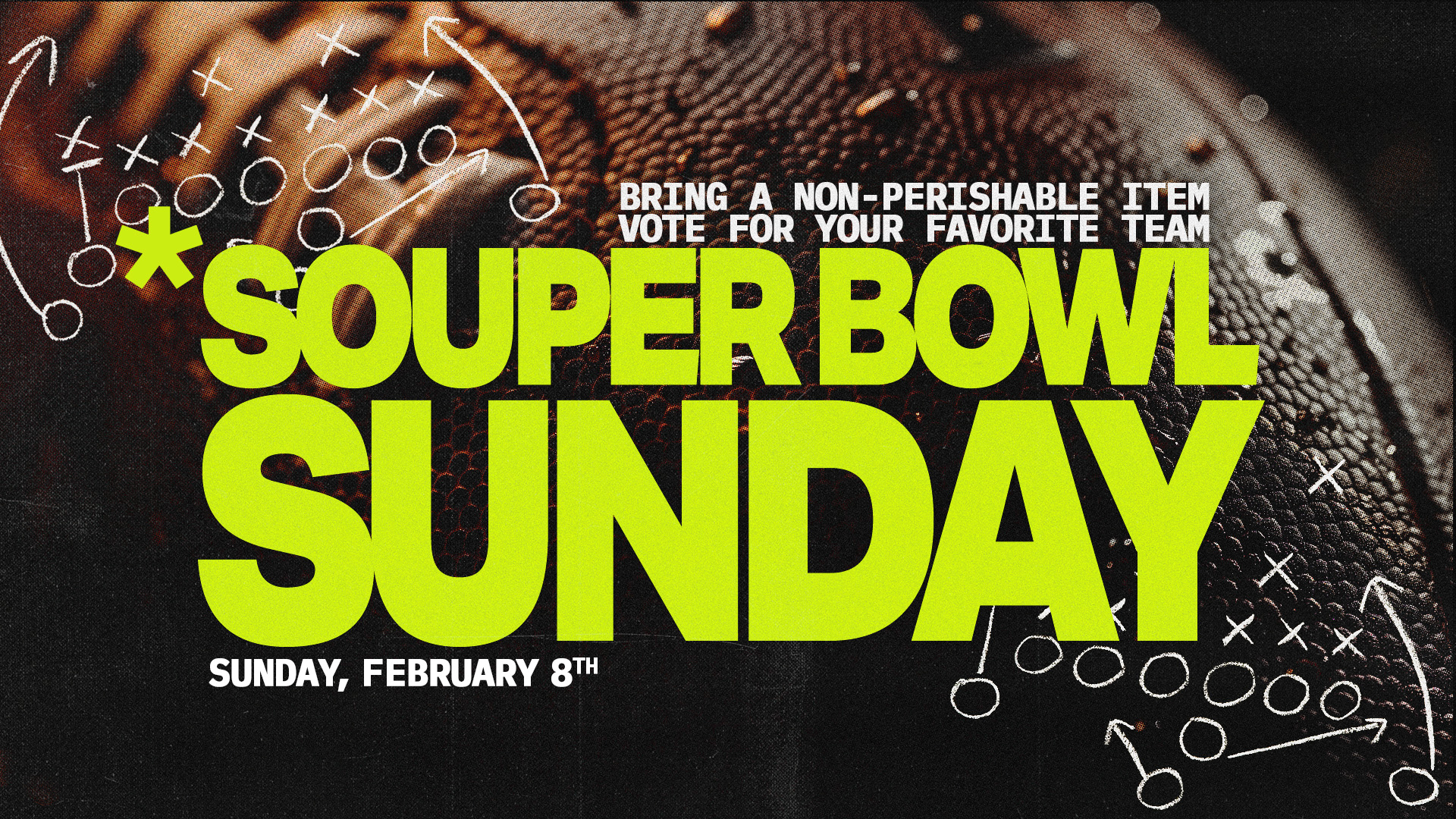 Wear your favorite team gear & bring a non-perishable item to vote for the winning Super Bowl team! Suggested items in more details.